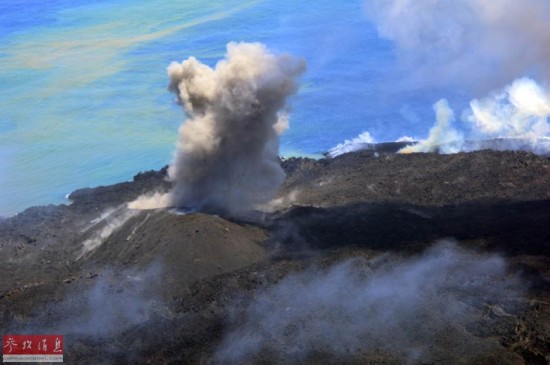 日本海上保安厅7月23日航拍获得的图像显示,小笠原诸岛的西之岛从2013年11月开始持续发生火山喷发,流出的熔岩使西之岛的面积扩大到火山喷发前的6倍左右。