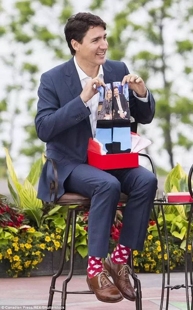 为了显示对国家的支持,这位加拿大总理还穿过红底加白色枫叶印花的袜子。