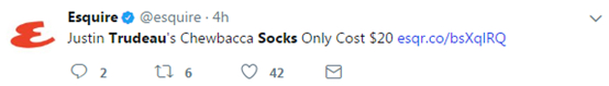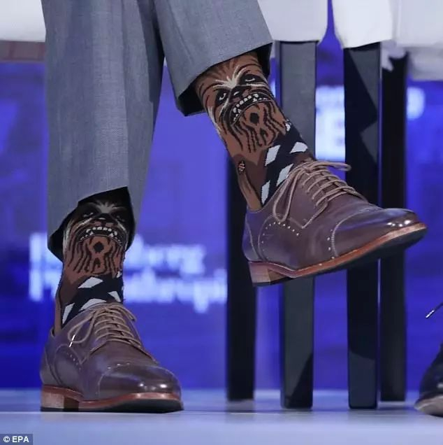 这双怪怪的袜子上印有《星球大战》中非常受欢迎的人物“楚巴卡” (Chewbacca, 又译作丘巴卡、乔巴卡等),每次特鲁多总理露出裤腿与皮鞋之间的间隙时,这双袜子总是无比吸睛。