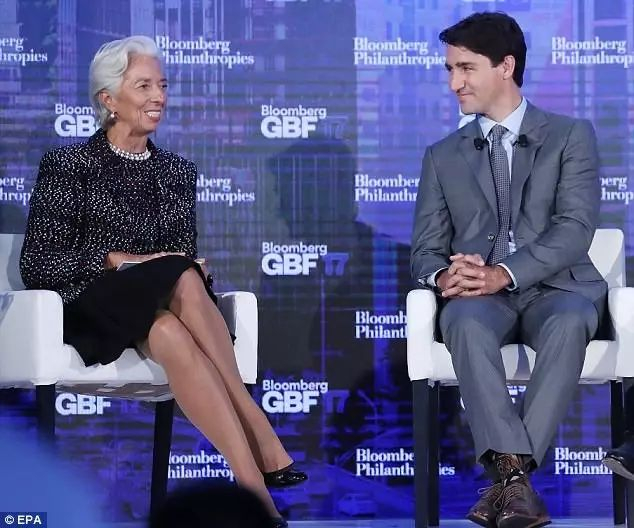 这位45岁的加拿大政客今日在纽约会见了国际货币基金组织总裁克里斯蒂娜·拉加德时,穿了一双怪怪的《星球大战》主题的袜子。