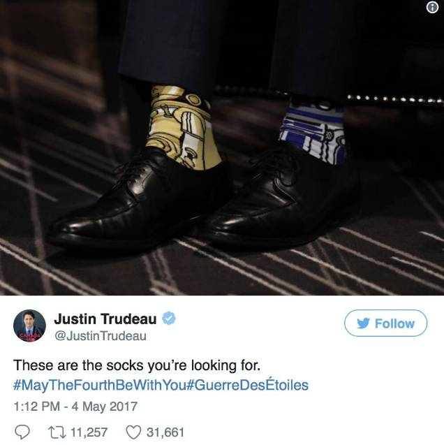 今年5月,特鲁多会见时任爱尔兰总理的恩达·肯尼时穿了一双“混搭”的《星球大战》R2D2机器人印花的袜子,并且因此上了新闻头条。