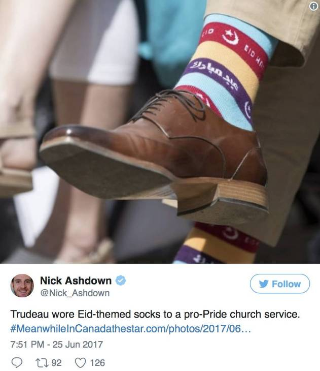特鲁多还穿过印有开斋节主题字样的袜子。