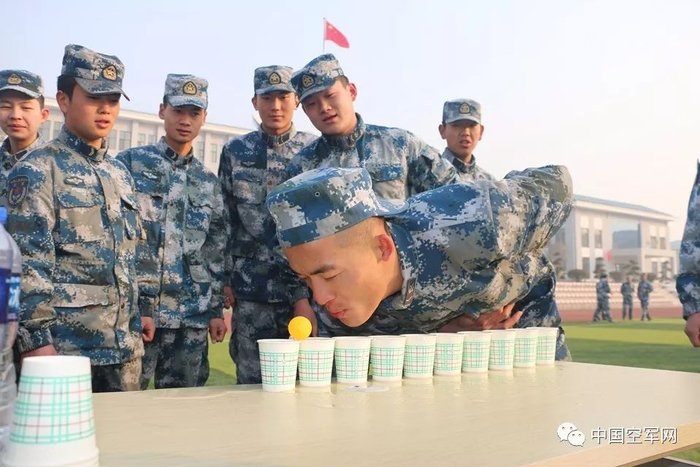 吹乒乓球是一个考验官兵耐心与细心的趣味活动。桌上放置一排十只盛满水的杯子,水面与杯面平齐。参赛者需要将一只乒乓球从第一只杯子依次吹到最后一只杯子,用时15秒以内者获得3张奖券,用时超过15秒者获得2张奖券。