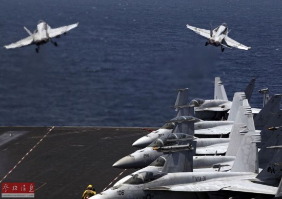 8月11日,美军战机从波斯湾“乔治·H·W·布什”号航空母舰甲板上起飞前往伊拉克执行任务。
