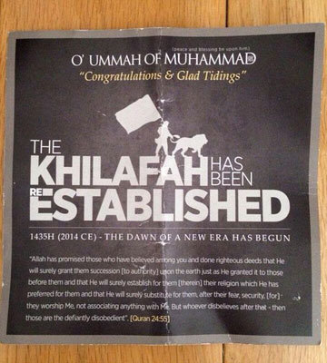 传单正面印着“新世纪的黎明已经到来”等字样,大肆宣扬“伊斯兰国”的理念。