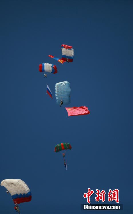 8月4日,俄罗斯“坦克两项-2014”国际竞赛在莫斯科郊区阿拉比诺靶场拉开帷幕。中国队坦克手当天驾驶国产96A型坦克,以绿色迷彩配红色国旗亮相。在当天午间进行的对坦克目标、直升机目标、反坦克榴弹发射器目标等的射击项目中,中国队全部命中目标。图为各国代表队跳伞亮相。 中新社发 贾靖峰 摄