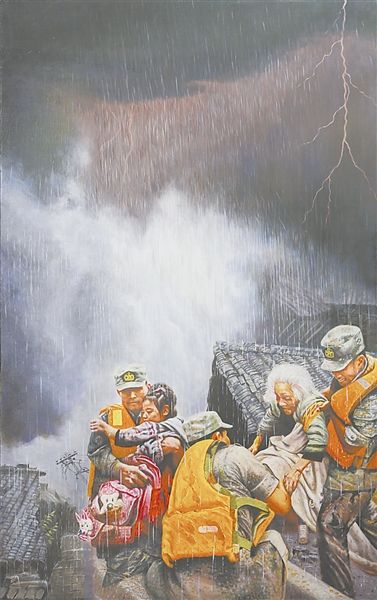 品 画《危难时刻》以一个惊心动魄的场面,描绘了人民子弟兵在抗洪抢险一线舍身救助受灾群众的英姿和风貌。画面主体由三名奋力抢救老人和儿童的战士构成,背景濒危的瓦房、如注的雨幕、刺眼的闪电……充分渲染了环境的险恶。作品构图别致,色调明快,人物生动传神,具有强烈的表现力和视觉冲击力,准确地表达了危难时刻见真情的军民鱼水关系,成功地塑造了人民子弟兵无私奉献的英雄形象。(许向群)