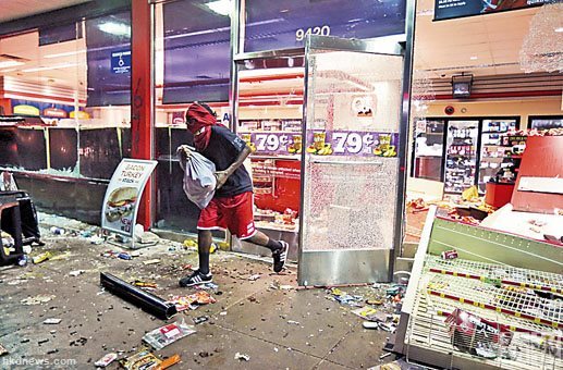 据香港《新报》网站8月12日报道,10日晚上,当地数千民众出席烛光集会,悼念死者,但集会过后,部份人乘机捣乱,闯入多间店铺大肆破坏、抢掠及纵火,包括便利店,找换店、服装店及酒吧都被波及;有示威者捣毁警车及电视台采访车。