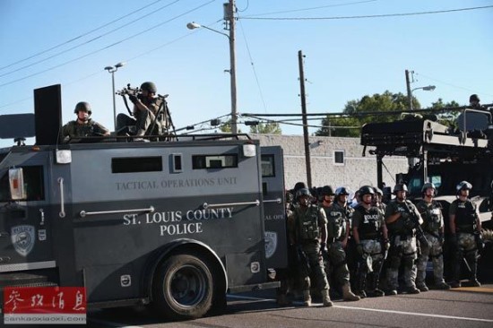 据法新社8月14日报道,从重型突击步枪到稳坐在重型装甲车上身着迷彩服的警员:笼罩密苏里小镇弗格森的暴力事件凸显饱受诟病的美国执法部门日益军事化的问题。