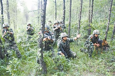 图片 军报记者 2014.08.2005:10 关注 8月上旬,武警黑龙江省边防总队鸡东边防大队机动中队冒着酷暑组织野外训练,锤炼官兵应急机动能力。图为该中队进行丛林围捕训练张 伟摄 ■新华社记者 华晔迪 裘立华