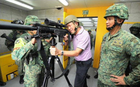 新加坡国防部长黄永宏在城市战实弹射击训练设施内试射