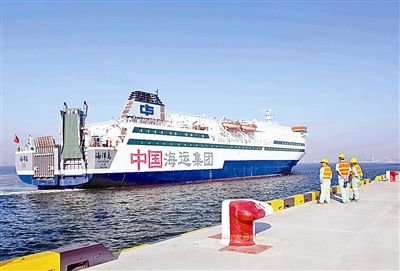 图:2014年6月28日,天津港国际邮轮码头二期开始投入使用。图为当日天津港国际邮轮母港码头工人迎候“海洋岛”号客滚船首次到来。