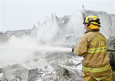 美国加利福尼亚州北部纳帕地区24日凌晨发生地震,震级已最新修正为6.1级,这是继1989年普列塔山6.9级地震之后,旧金山湾区25年来发生的最强烈地震。图为在美国纳帕地区,一名消防员向一处因地震引发火灾的区域喷洒泡沫。 新华社/法新