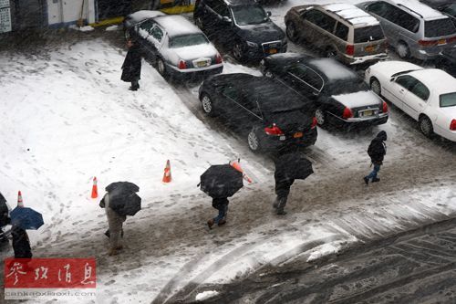 资料图片: 2013年3月8日,纽约上班族在皇后区的一处街道冒雪前行。新华社记者王雷摄。