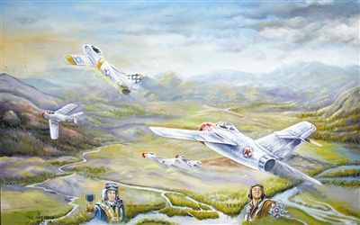 这幅油画的捐赠者正是当年我军米格-15战斗机的驾驶者、抗美援朝二级战斗英雄、原南京军区空军副司令员韩德彩中将。这幅油画是一位美国著名油画家为韩德彩和美国双料王牌飞行员哈罗德·爱德华·费席尔创作的空战图。