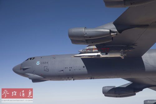 2013年5月1日,美国空军B-52H型轰炸机挂载X-51A型“乘波者”高超音速飞行器从加利福尼亚州爱德华兹空军基地升空。新华社/路透