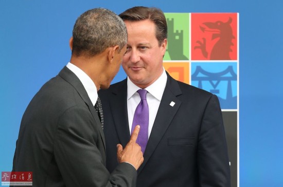 英国 威尔士-9月4日,北约峰会在新港凯尔特庄园酒店举行,美国总统奥巴马用手指着英国首相卡梅伦。