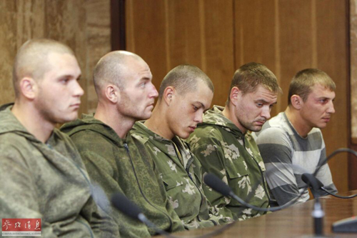 8月27日,乌克兰基辅,被乌克兰逮捕的俄罗斯士兵出席新闻发布会。乌克兰当局25日称,政府军当天在乌克兰东部俘获10名俄罗斯伞兵。俄罗斯国防部一名官员26日说,多名俄罗斯军人在边境巡逻时“误入”乌克兰,被乌方拘留。(资料图片)