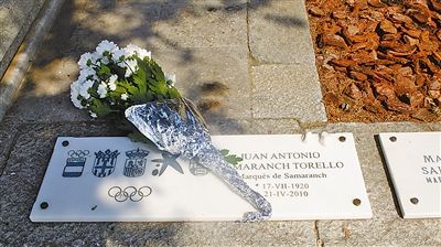 相比于周围几座豪华庞大的陵墓,萨翁的墓地可谓简朴之至。几块半米见方的花岗岩盖板上,固定着一小块白色大理石碑,上面只刻有萨马兰奇的姓名、生卒日期,再无只言片语。仅有的小小五环标志,凝聚着主人一生的传奇与伟大。萨马兰奇,这位执掌国际奥委会21年,带领国际奥委会脱胎换骨的“世纪体育领导人”,这位曾在1984年洛杉矶奥运会上特地为中国第一位奥运冠军许海峰颁奖,30年里29次访华的中国人民老友,竟如此朴素地长眠于此。面朝萨翁陵墓,记者默然,唯有深深鞠躬,献上鲜花,以表敬意。