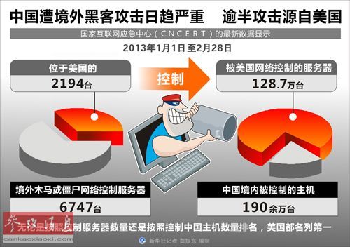 中国遭境外黑客攻击日趋严重,逾半攻击源自美国。新华社记者 曲振东 编制