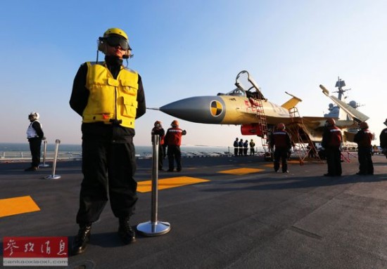 2012年11月25日,“辽宁舰”舰面人员在为歼-15舰载机进行保障工作。(资料图片)
