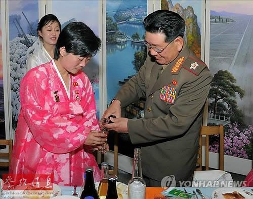 5月1日,在平壤金正淑纺织厂工人宿舍举行的庆祝五一节工人宴会中,人民军总政治局局长黄炳誓(右)为参加宴会的女工斟酒。(朝中社)