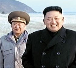 2014年3月5日,朝鲜电视台播出的视频显示,崔龙海(左)陪在金正恩身边。