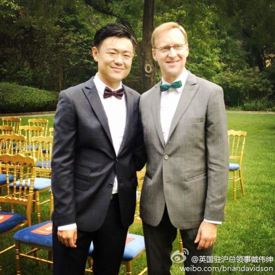 另据香港《南华早报》网站9月9日报道,英国驻上海总领事戴伟绅6日在微博上发布了自己和同性伴侣张志鹄结婚的照片。截至周一下午,这条微博已经被转发超过3万次,有将近2万条评论,许多人对这对伴侣表示祝贺,并送上了真挚的祝福。
