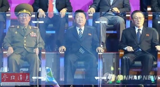 资料图片:朝鲜高层代表团出席仁川亚运会闭幕式,观看文艺演出。从左至右依次是朝鲜人民军总政治局局长黄炳誓、朝鲜劳动党中央委员会书记崔龙海、朝鲜劳动党中央书记兼统一战线部部长金养健。(韩联社)