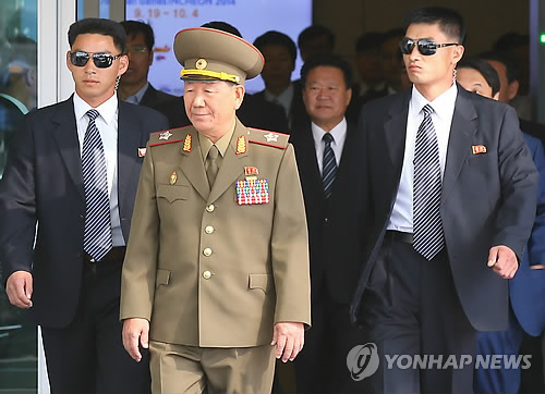 当地时间2014年10月4日,韩国仁川,韩国统一部发言人林丙哲4日上午临时举行记者会表示,朝鲜人民军总政治局局长黄炳誓、朝鲜劳动党中央委员会书记崔龙海、朝鲜劳动党中央书记金养健等朝方高官今日访韩并出席仁川亚运会闭幕式。朝方高官已于4日上午9时52分许乘机抵达仁川国际机场。图片来源:环球网