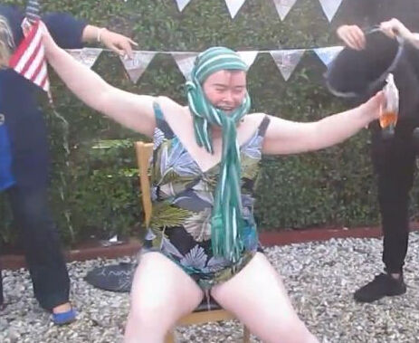 她头包毛巾、手拿美国国旗,一边唱她的成名作──《悲惨世界》名曲《I Dreamed A Dream》,让人帮她连浇4桶冰水,还包括她自倒一桶,完成后她说:“好冷,湿透了。”