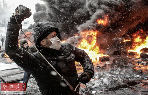 资料图:2014年1月22日,在乌克兰首都基辅市中心,示威者向警察投掷石块。