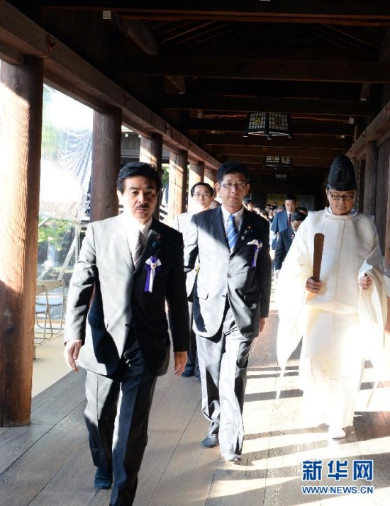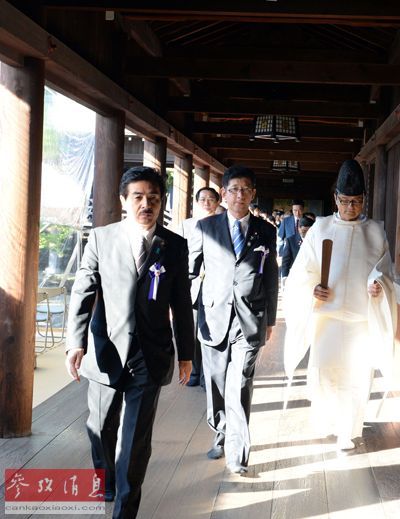 2014年10月17日,在日本东京靖国神社本殿,一名祭司引导一些日本国会议员参拜。新华社记者马平摄