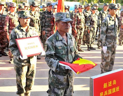 资料图片:9月29日,三沙市委、市政府,三沙警备区在9个岛礁成立民兵国旗班,成立仪式在西沙永兴岛举行。新华社发(杨冠宇摄)