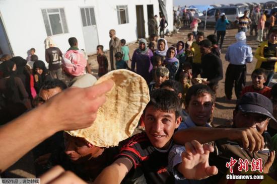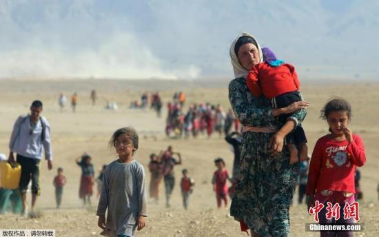 资料图:当地时间2014年8月12日,伊拉克与叙利亚边境,大量流离失所的伊拉克少数教派亚齐德民众跨越库尔德武装与ISIS激战的前线进入库尔德武装控制区,逃离“伊斯兰国”激进分子的袭击。
