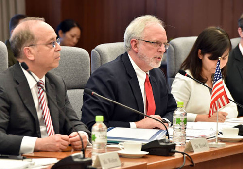 10月8日,在日本东京,美国助理国务卿丹尼尔·拉塞尔(左)、国防部部长助理施大伟(中)参加日美外交和防卫局长级会议。当日,日美政府公布了新日美防卫合作指针的中间报告,宣称将在新指针中“适当体现”日本政府有关扩大自卫队活动范围的内阁决议内容。(互联网图片)