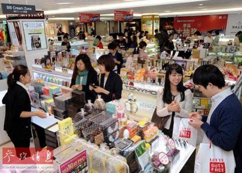 韩国百货商店积极准备在今年五一黄金假期吸引外国游客。图为中国游客在韩国乐天免税店内挑选化妆品。