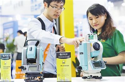 10月25日,以“转型升级,振兴产业”为主题的第四届全国地理信息技术装备展在南昌国际展览中心举行。据悉,展会共吸引国内外近300家测绘企业参展,众多国产自主研发设备在本届展会上首次公布。图为工作人员(左)在为参观者介绍一款全站仪。新华社发