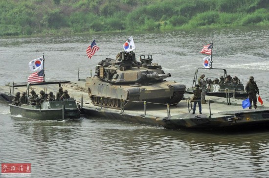 资料图片:美韩军方在涟川举行跨河演练,图为一辆美国M1A2坦克通过韩军方驳船过河。