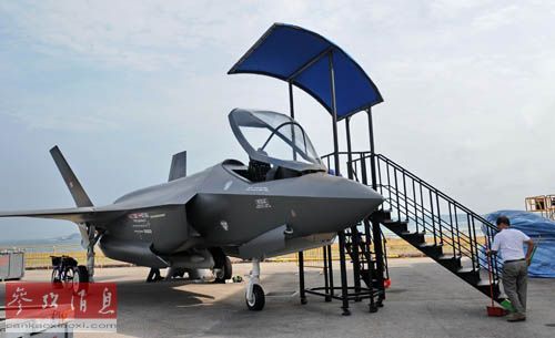 在2014年新加坡航展上,160多家美国企业参展,以扩大在亚太地区的国防销售。图为美国展出的F-35战斗机全尺寸模型。(法新社)