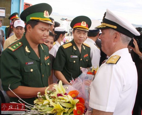 2011年7月15日,在越南岘港仙沙港,越南军方代表迎接美国海军舰队人员来访。(资料图片)