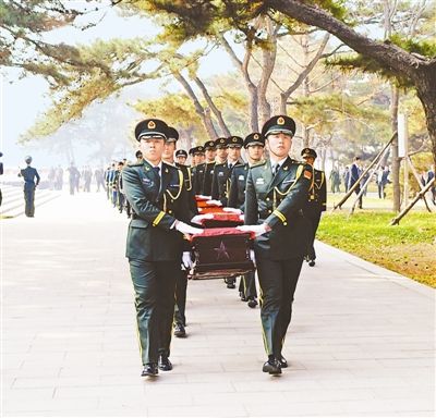 此刻,抬着烈士遗骸的礼兵段德耀难掩心中的激动,泪花在眼圈里打转儿。和今天参加安葬仪式的75名礼兵卫兵一样,段德耀来自陆军第39集团军。60多年前,第39军曾经在朝鲜半岛驰骋沙场,歼敌4万余人,立下赫赫战功,涌现出一大批可歌可泣的英模人物。