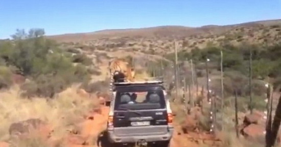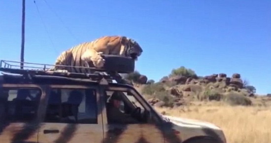 国际在线专稿:据英国《每日邮报》9月28日报道,在野外探险能近距离接触老虎等大型动物,是件很刺激的事。近日,一群游客在南非一处野生动物保护区观光时,一头老虎跳上了吉普车的车顶,并随车子行驶到很远处才跳下离去。这一过程被人拍成视频并上传至网络。