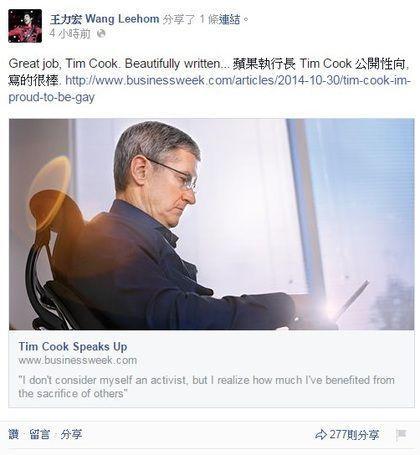 [摘要]苹果CEO库克投书公开出柜承认同志,王力宏随后在脸书转库克公开信,写“公开性向,写的很棒”。没想到歌迷跟网友留言调侃王力宏,力顶他出柜:“你也可以来个公开信”,“支持你,不要怕”。