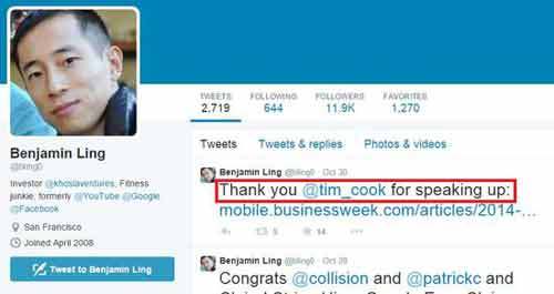 今年37岁的Benjamin Ling不只拥有帅气外貌,更拥有斯坦福大学资讯工程博士的学位,更曾在脸书、Google等公司担任要职,目前是硅谷创业投资公司Khosla Ventures的顾问。他30日在自己的推特中,写下“谢谢你勇敢的说了出来”(Thank you @tim_cook for speaking up),同时标记库克的推特账号。