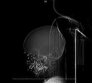 至九院时,男孩受伤已超过8小时。经过诊断,男孩面部近距离被“霰弹枪”击伤,导致面部上颌窦开放伤,右侧面部上颌窦全部被打穿,右侧面部皮肤和肌肉被全部破坏,上颌骨及下颌骨折并有骨组织缺损,近百粒弹珠状碎片留在面部的软组织及骨骼内,且伴随有面部皮肤火器烧伤。