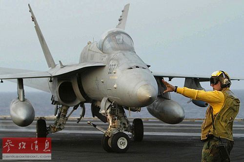 资料图片:一名士兵在美军“卡尔·文森号”航空母舰引导一架F/A-18大黄蜂战机。新华社/美联