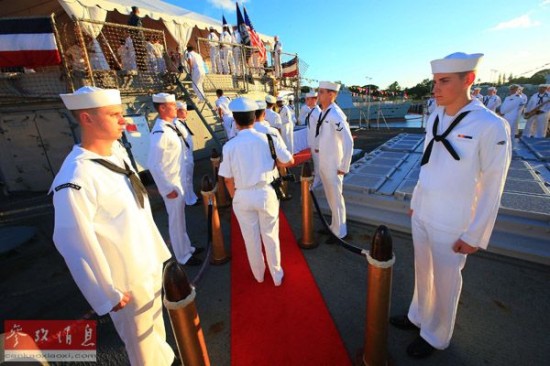 资料图片:中美海军官兵在夏威夷珍珠港开展军事文化交流活动。图为2013年9月7日,在美国夏威夷珍珠港,中国海军官兵登上美国海军“伊利湖”号导弹巡洋舰,参加甲板招待会。新华社记者 查春明摄