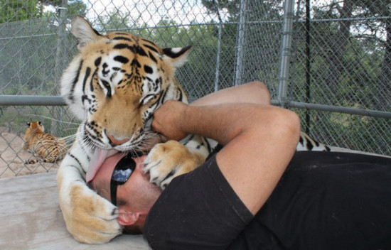 据台湾东森新闻网10月30日报道,美国男子卡尔因故有一只眼睛看不见,但却长期和14只大型猫科动物生活在一起,包括六只老虎、两头狮子和一只大山猫。他与这些动物非常亲近,虽然曾被猎豹咬伤鼻子,肩膀也因为和成年孟加拉虎扭打而受伤,但他认为和这些动物生活在一起是相当值得冒险的事。