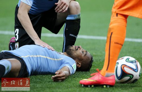 资料图片:2014年6月19日,乌拉圭队球员阿•佩雷拉在与英格兰队球员拉•斯特林拼抢时,被其膝盖撞头倒地。新华社记者周磊摄
